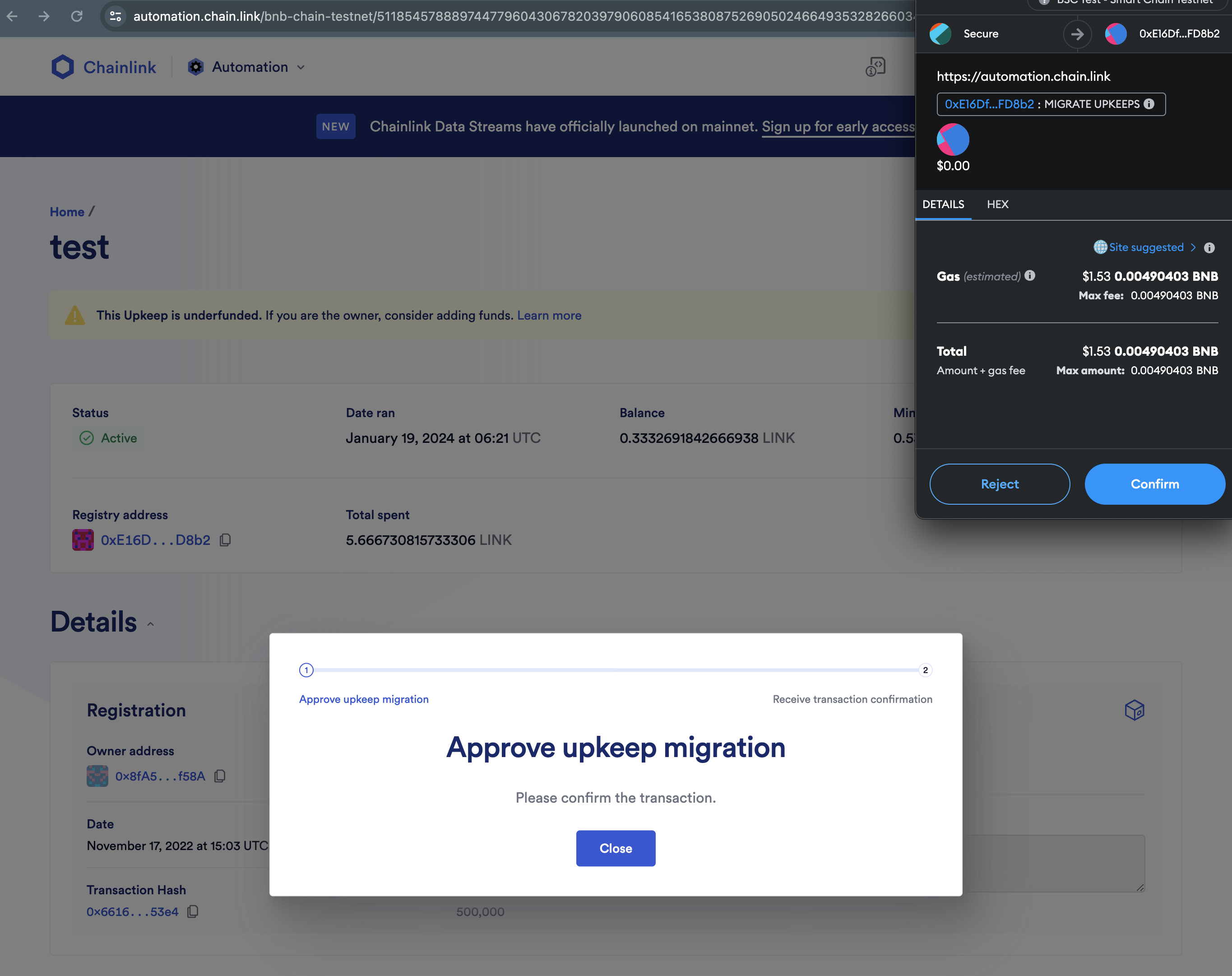Follow the prompts to approve and confirm the transactions in your wallet to migrate your upkeeps.