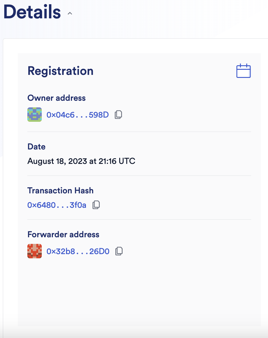 to the previous registry address, you must update it to the newly created forwarder address. The forwarder address becomes available only after the upkeep has been migrated. This forwarder address will remain constant in future migrations.