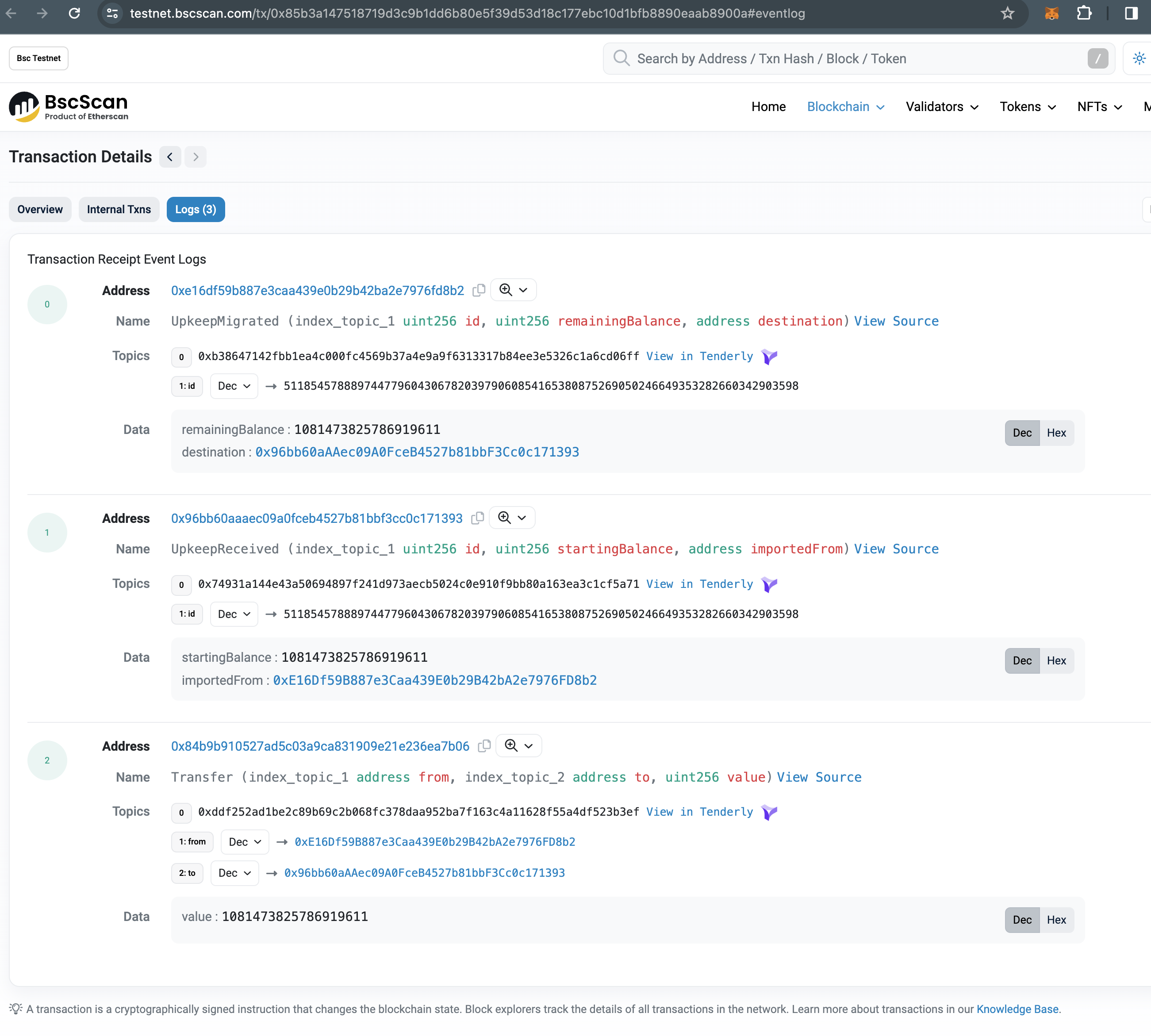 Upkeeps that are successfully migrated will show the following transaction logs: