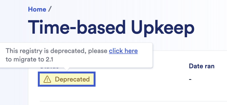 If you have any upkeeps that are not yet migrated to v2.1, using older registries that are paused, the only action you can take is either to migrate these upkeeps or to cancel them. Affected upkeeps will show a Deprecated label in the Chainlink Automation App. When you hover over this label, it displays a link you can click to begin the migration process for the upkeep: