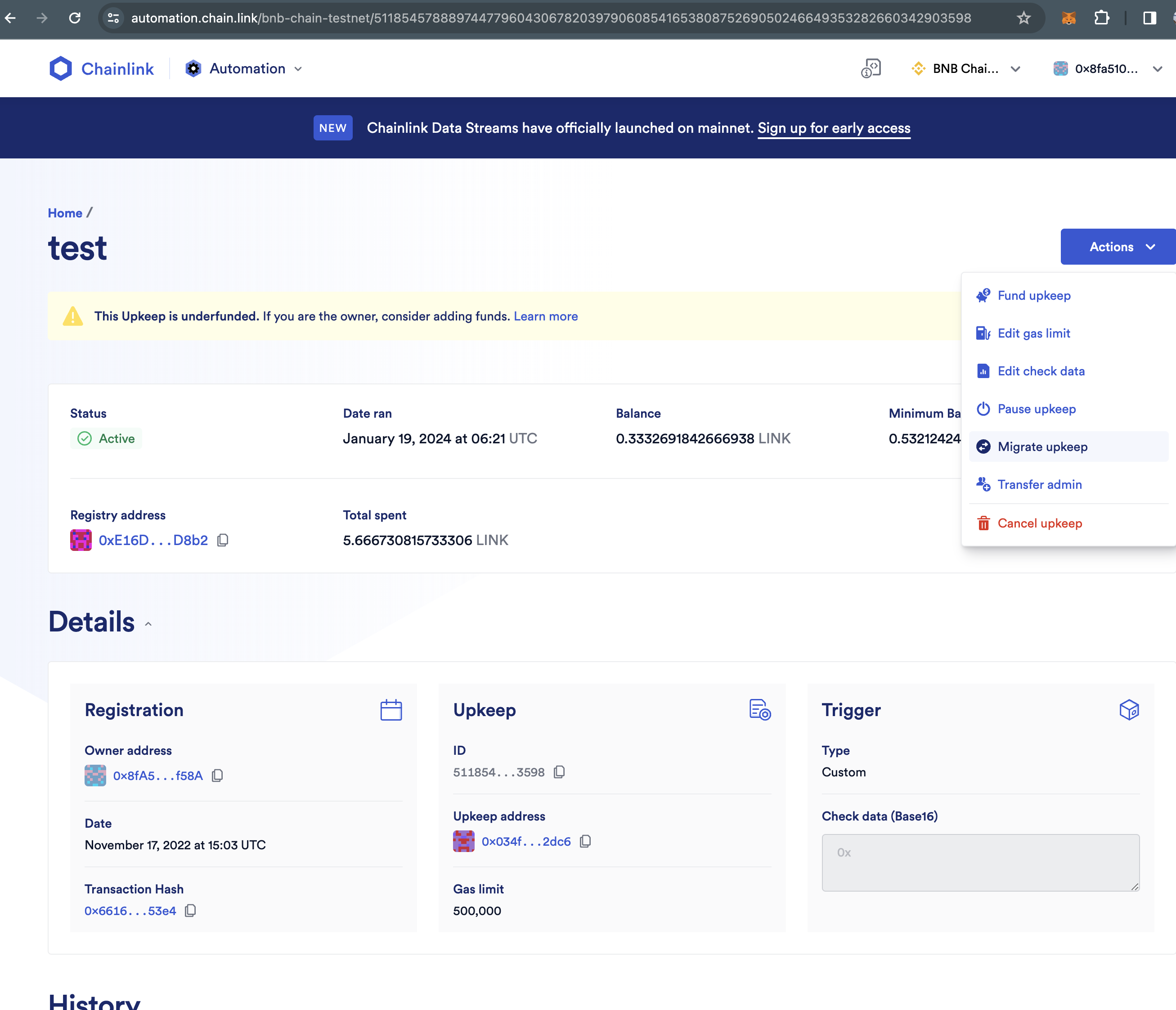 Navigate to the Upkeep in the Chainlink Automation App.