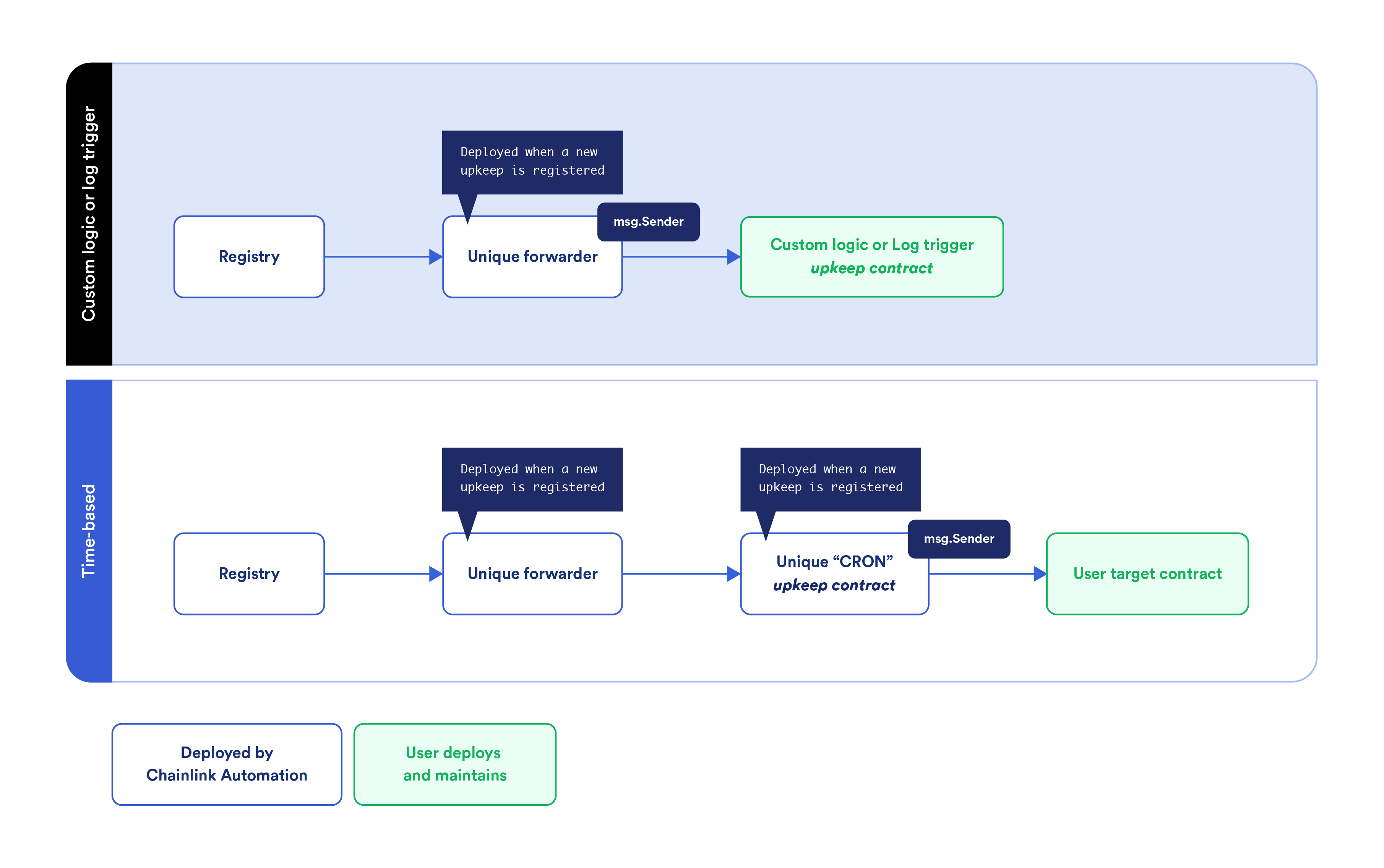 This diagram shows the flow of different contracts that Automation 2.1 deploys for new and migrated upkeeps. Compared to custom logic and log trigger upkeeps, time-based upkeeps have an additional contract:
